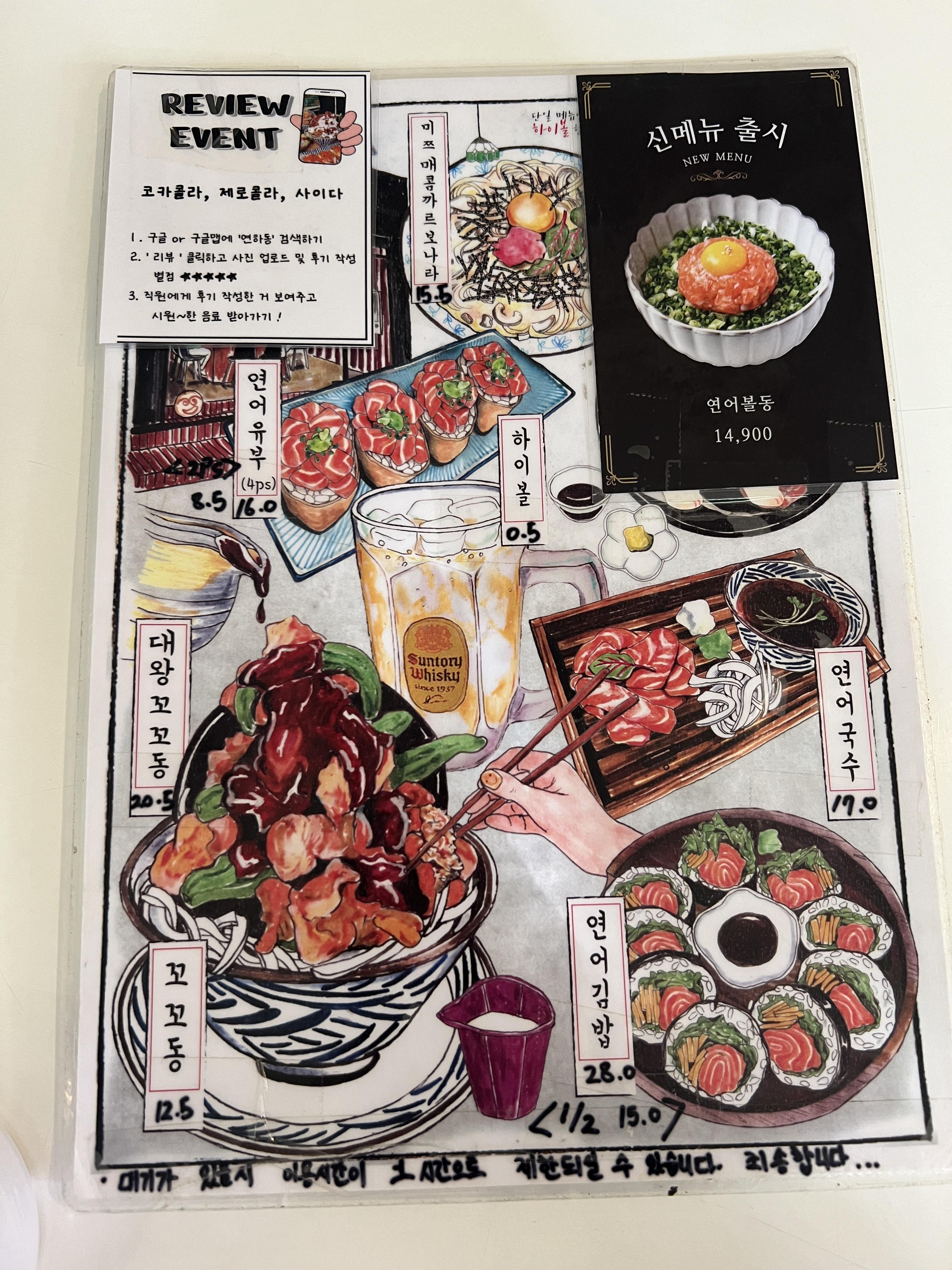 테이블 한쪽 모서리에 붙어 있는 음료 메뉴판 & 꼬꼬동과 연어국수 먹는 법!