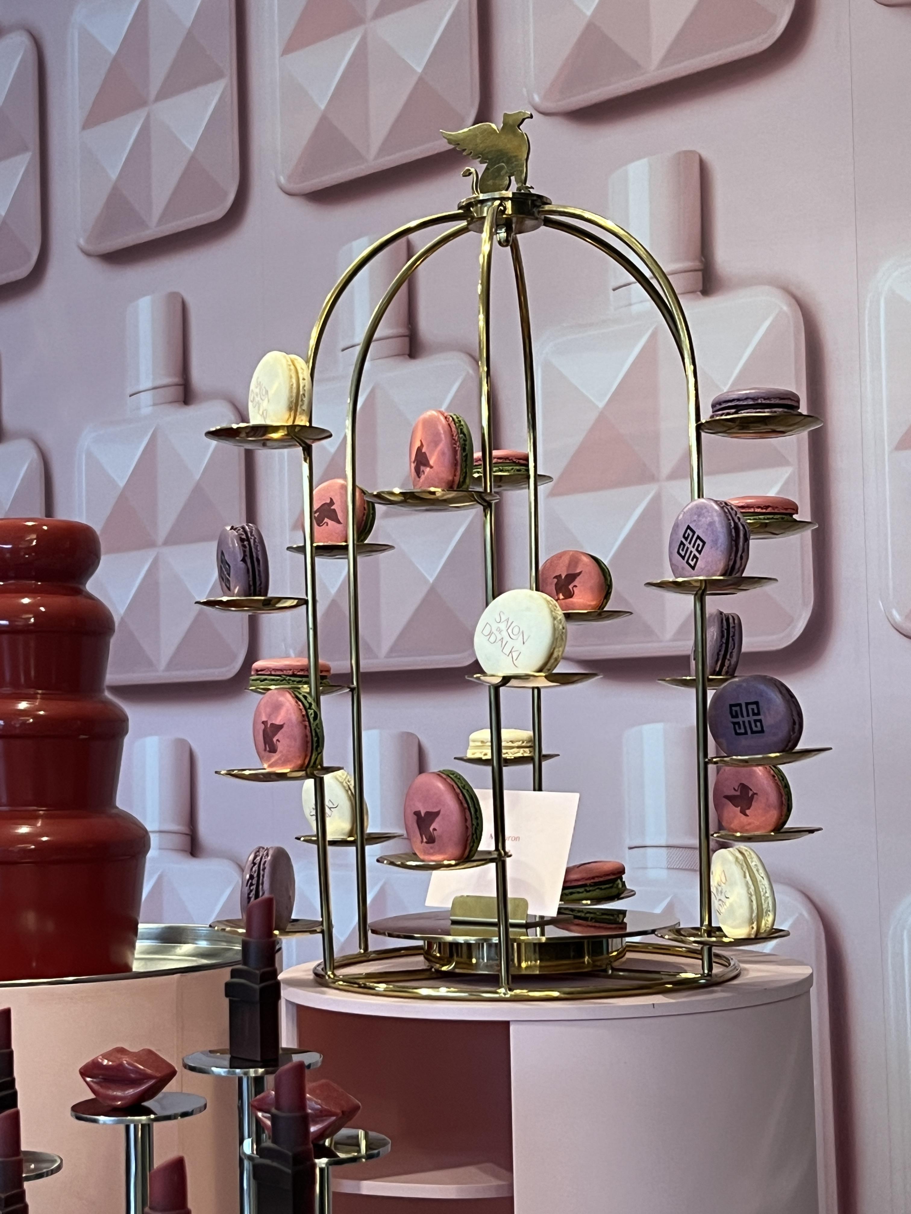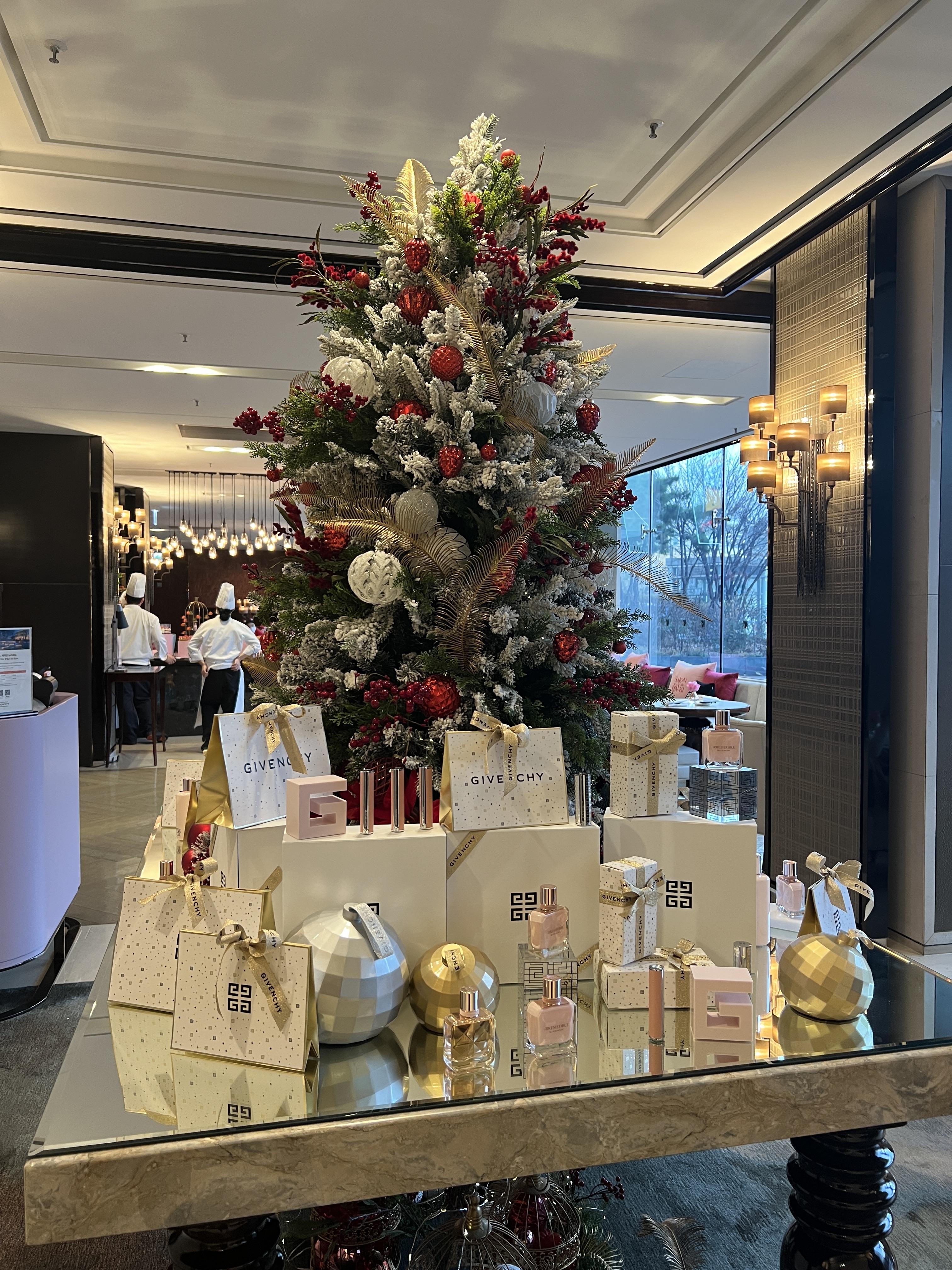 딸기 뷔페 들어가는 입구 앞에는 크리스마스트리와 지방시 뷰티 제품들이 전시되어 있다.